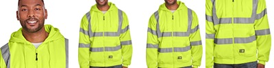 9 oz., 100% polyester fleece; 5 oz., lightweight 100% polyester mesh lining; ANSI/ISEA 107-2015 type R class 3 certified; 2" reflective tape; Nylon front zipper; Double layered three-piece hood; Oversized front pockets; Knit cuffs and waistband;