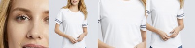100% polyester wicking knit with True Hue Technology™ that helps prevent dye migration; Moisture-wicking; Ladies' fit; Tear away label; V-neck collar; Fully reversible; Each layer hemmed separately for embellishment;