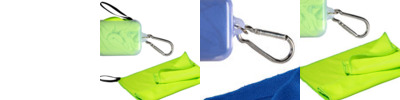 - Mini cooling towel folded in in compact case with carabiner attached