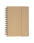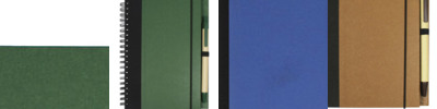 Cover is made of 80% post consumer recycled materials, metal spiral binding is made of 90% post consumer recycled materials, pen barrel is made of 100% post consumer recycled paper
