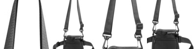 Removable upgraded 53" adjustable shoulder strap with metal clips that connect to the bag. Removable wrist strap on the side.